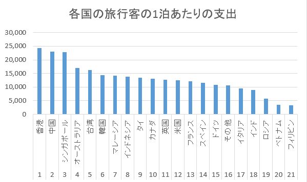 米山 隆一 On Twitter ここの所訪日外国人が落とすお金が話題になっていたので 観光庁の訪日外国人消費動向調査を見てグラフにしてみました 香港 中国 シンガポールが突っ切って高いですが 話題の韓国も十分上位です 但し宿泊日数は少ない いずれにせよ